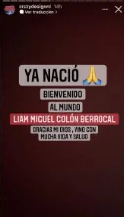“Ya nació. Bienvenido al mundo, Liam Miguel Colón Berrocal. Gracias a Dios mi Dios, vino con mucha vida y salud”, publicó junto otra historia con las imágenes en la clínica donde la presentadora dio a luz.