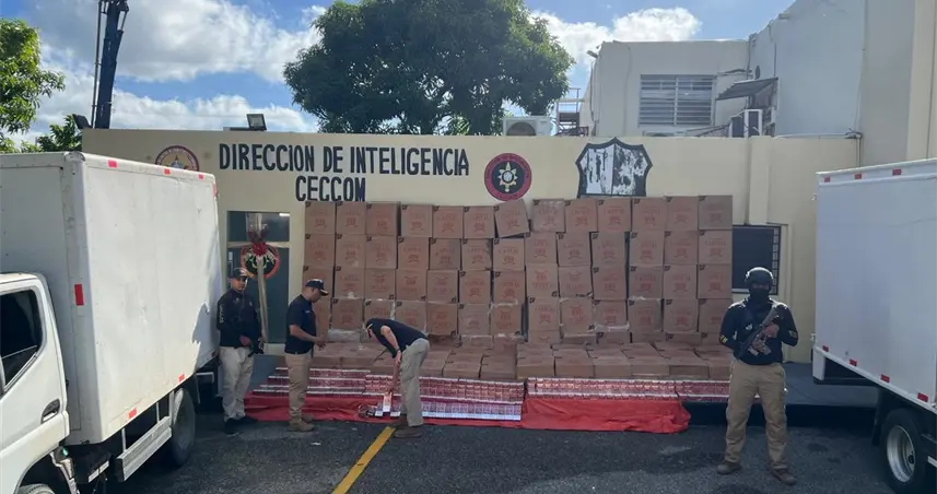 Santo Domingo.– Miembros de la Dirección de Inteligencia del Cuerpo Especializado de Control de Combustibles y Comercio de Mercancías (CECCOM) decomisaron este lunes 830,000 unidades de cigarrillos que eran transportados en condición de contrabando en el sector Altos de Alameda, Santo Domingo Oeste.
