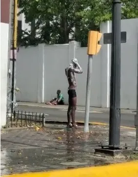 SANTO DOMINGO.- De cabeza a pies y si como estuviera en el baño de su casa, un hombre fue captada en video mientras se bañaba en una esquina donde se unen las avenidas César Nicolás Penson con Máximo Gómez.