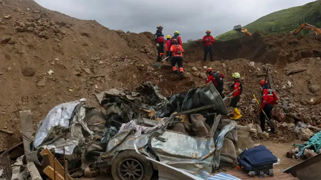 Bajo los restos del deslizamiento, que abarcó una superficie de 24,3 hectáreas quedan todavía por recuperar una treintena de personas.