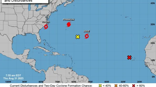 José es un pequeño sistema que avanza en dirección norte con vientos máximos sostenidos de 40 millas por hora (65 km/h) y va a ser absorbido por el huracán Franklin el viernes, según el Centro Nacional de Huracanes (NHC) de EE.UU.