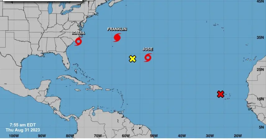 José, formada en medio del Atlántico y localizada hoy unas 785 millas (1.265 km) al este sureste de Bermuda, no supone por ahora peligro alguno para tierra, al contrario que Idalia, que 24 horas después de entrar en Florida desde el Golfo de México como huracán de categoría 3, amenaza ahora desde el mar a Carolina del Norte.