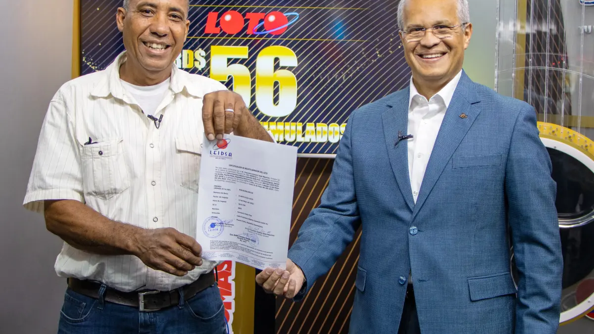 SANTO DOMINGO.- El señor Francisco Ant. Sosa Mauricio, recibió el certificado que lo acredita como ganador de la proporción de 56 millones, monto que va a compartir con José Luis García, ya que ambos acertaron con los 6 números del Loto:5-8-23-27-33-35, en el sorteo del pasado sábado 14 de mayo. A cada uno de ellos le corresponden 28 millones de pesos.