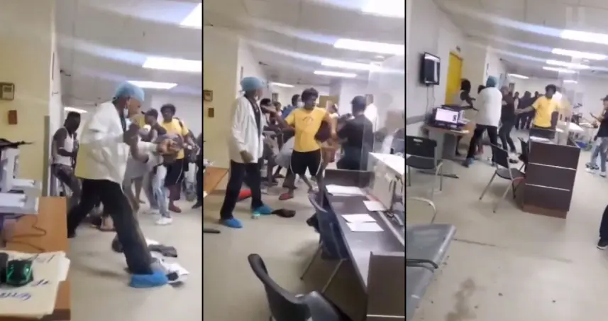 En un audiovisual que llegó a este medio, se observa al personal de salud y un grupo de personas de nacionalidad haitiana protagonizando un altercado con golpes y patadas en lo que parecer ser el área de emergencia del centro médico.