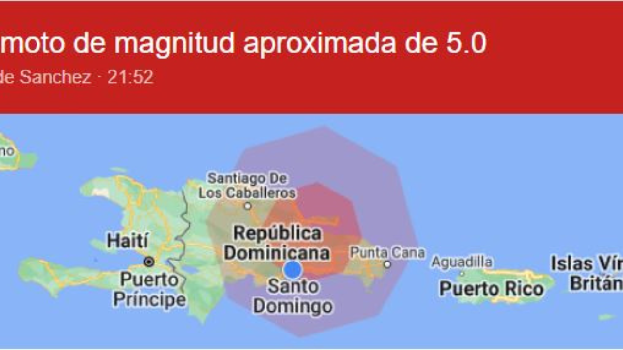 SANTO DOMINGO.- Se registró la noche de este jueves un terremoto de magnitud aproximada de 5.0 a 10 kilómetros de profundidad, al suroeste de Sánchez, bahía de Samaná.