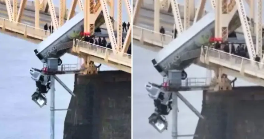 Las imágenes de la cámara del tablero muestran el camión que se desvía de su carril para evitar un vehículo detenido antes de chocar. La cabina del camión y a la conductora en su interior terminaron colgando 75 pies (23 metros) sobre el río Ohio. Los bomberos realizaron un dramático rescate de la conductora, usando una escalera aérea y una polea para llevarla a salvo.
