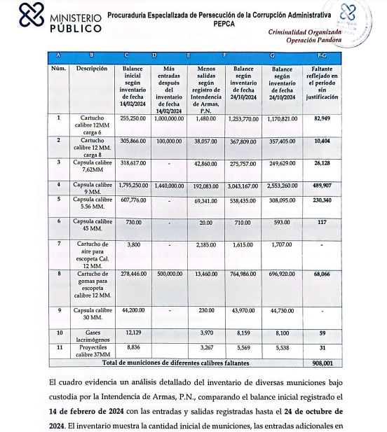 El expediente detalla que el Coronel Narciso Antonio a sabiendas de los resultados de la relación de existencia de municiones en los depósitos de la Intendencias de Armas realizado en el mes de octubre de 2024, se encargó que no se hiciera el reporte de las municiones faltantes.