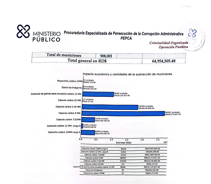 De acuerdo con el expediente de este caso, el 24 de octubre del año 2024 se realizó una auditoría y salió a la luz que 908 mil municiones de diferentes calibres y accesorios fueron robadas del Departamento II de la Intendencia de Armas de la Policía Nacional. La sustracción de estas municiones para la Policía Nacional y el Estado dominicana significa un impacto de (RD$64,954,505.48)