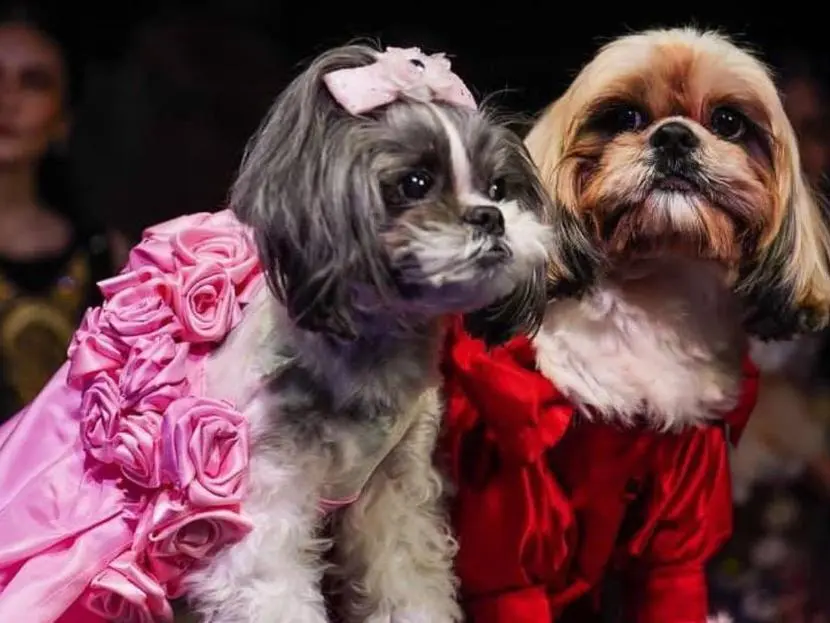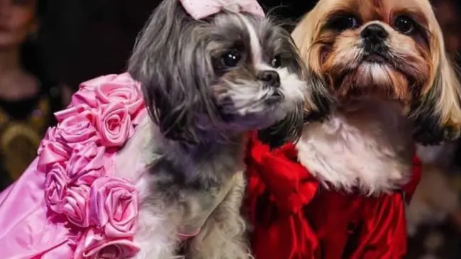 En el desfile, varios maniquíes (en su mayoría mujeres) llevaban en brazos o paseaban con una correa a los caninos los auténticos protagonistas de la pasarela que vestían prendas de colores chillones, en contraposición con los tonos oscuros de la ropa de sus paseadores.
