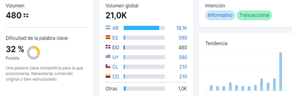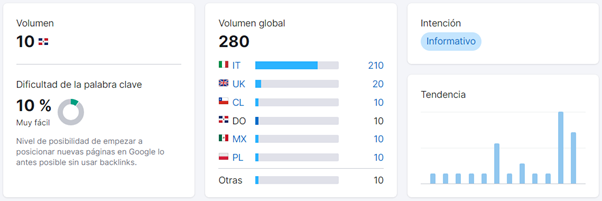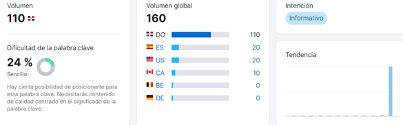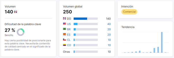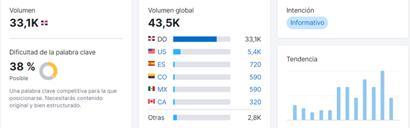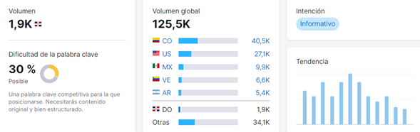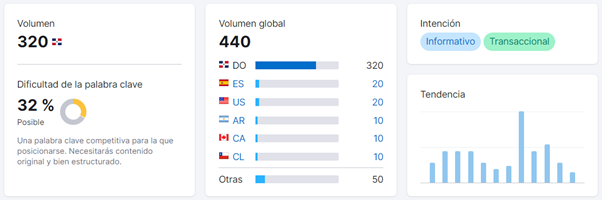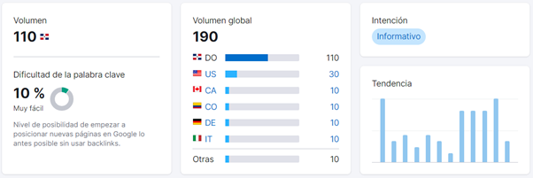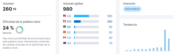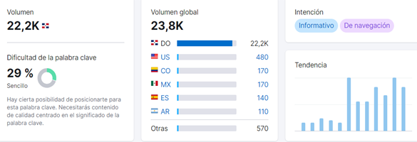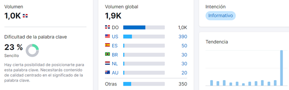 3. Volumen global: Da una idea del interés a nivel mundial o, en este caso, a nivel nacional (República Dominicana). Si una palabra clave tiene un volumen global alto, significa que es relevante para una amplia audiencia.