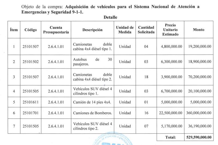 Santo Domingo.– SANTO DOMINGO.- El Sistema Nacional de Atención a Emergencias y Seguridad 911 inició un proceso de licitación para la compra de 52 vehículos por un monto de 529 millones, según un informe de la Solicitud de Compra o Contratación.