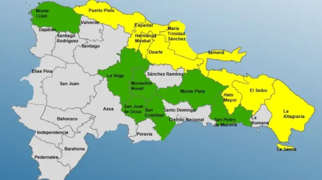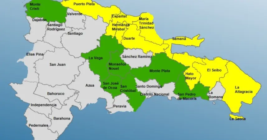 Mientras que las provincias que están en alerta verde son; Monseñor Noue, La Vega, Monte Plata, San José de Ocoa, Montecristi y San Pedro de Macorís.