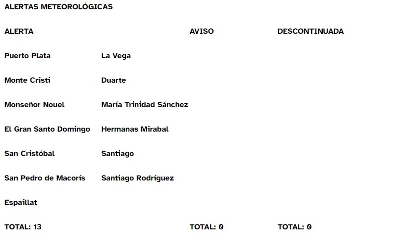 Se mantienen 13 provincias en alerta meteorológica debido a posibles crecidas de ríos, arroyos y cañadas, inundaciones repentinas, así como, deslizamiento de tierra: