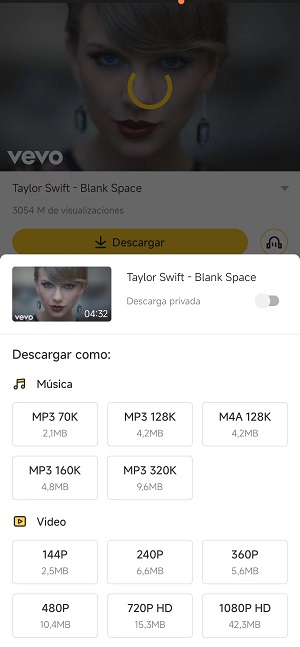 Al presionar sobre “descargar”, debes confirmar el formato y resolución que quieres para tu archivo. Si quieres solo la música, elige MP3, si quieres el video, elige MP4. Así de simple.