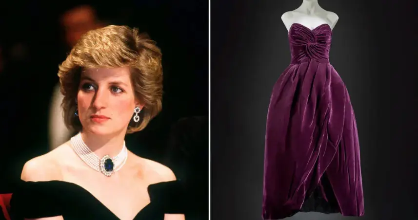 Se trata de un traje de noche en seda de terciopelo de color berenjena de estilo "infanta" y con una falda voluminosa en forma de tulipán, diseñado por Victor Edelstein, quien fuera su modisto durante casi una década, para la temporada de otoño de 1989, según un comunicado de la casa de subastas.