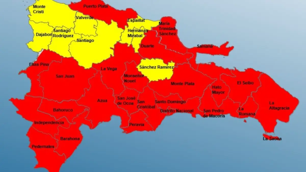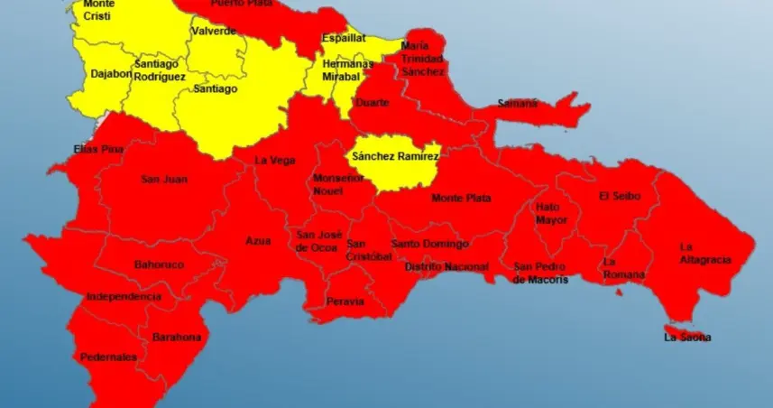 En alerta roja se encuentran: Santo Domingo, El Distrito Nacional, San Cristóbal, Peravia, Barahona, San Juan, Independencia, Puerto Plata, San pedro de Macorís, La Romana, San José de Ocoa, Azua, Pedernales, Bahoruco, Elías Piña, Duarte, María Trinidad Sánchez, Monte Plata, La Altagracia, La Vega, Monseñor Nouel, Hato Mayor, El Seibo y Samaná.
