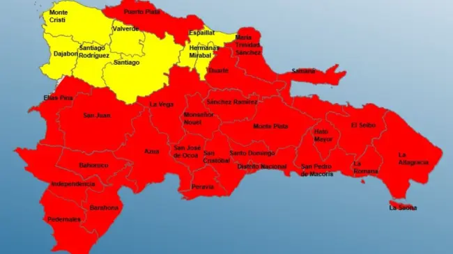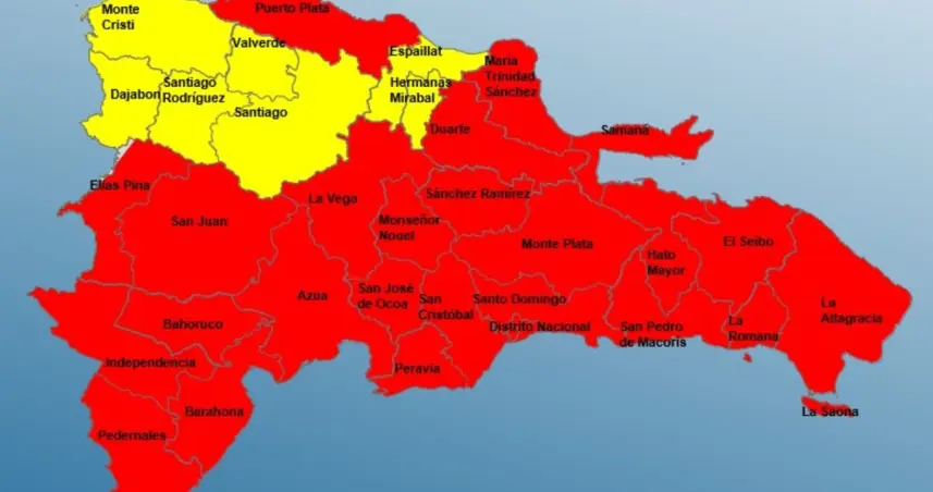 En alerta roja se encuentran: Santo Domingo, El Distrito Nacional, San Cristóbal, Peravia, Barahona, San Juan, Independencia, Puerto Plata, San pedro de Macorís, La Romana, San José de Ocoa, Azua, Pedernales, Bahoruco, Elías Piña, Duarte, María Trinidad Sánchez, Monte Plata, La Altagracia, La Vega, Monseñor Nouel, Hato Mayor, El Seibo, Samaná y Sánchez Ramírez.