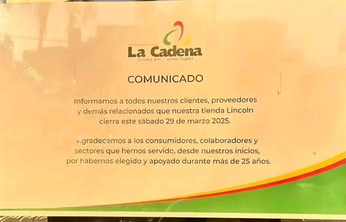 Santo Domingo. – Supermercados La Cadena anunció el cierre de su sucursal ubicada en la avenida Abraham Lincoln a partir del sábado 29 de marzo de 2025.