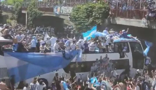 Argentina.- Dos hinchas se arrojaron desde un puente al ómnibus que transportaba este martes a la selección argentina de fútbol durante una caravana en la periferia de Buenos Aires para celebrar el triunfo en el Mundial de Qatar 2022.