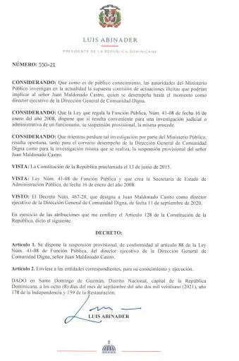 SANTO DOMINGO.- Por medio del decreto 550-21 el presidente de la República, Luis Abinader, suspendió a Juan Maldonado Castro, director de Comunidad Diga, por sus presuntos vínculos con actos de lavado de activos procedentes del narcotráfico.