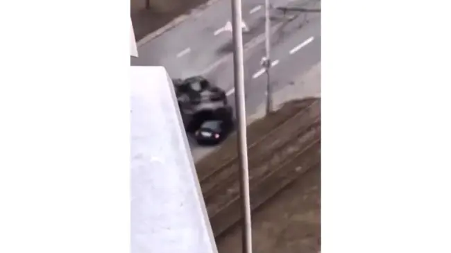 En las espeluznantes imágenes se puede apreciar un tanque de guerra durante su acceso al distrito de Obolon, en un momento que circula por una de las carreteras, el tanque vira y se dirige a un vehículo que circulaba en sentido contrario y literalmente pasa sobre él y lo aplasta.