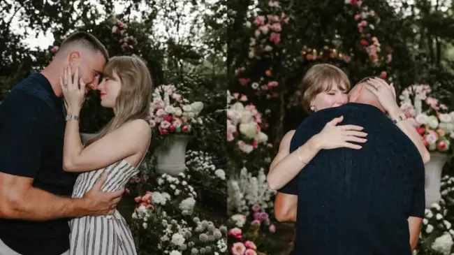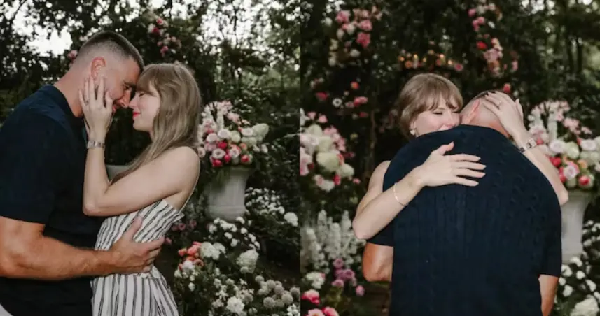 En la primera imagen, Kelce aparece de rodillas frente a Swift bajo un elaborado arco floral, mientras que en otra foto puede verse a la cantante luciendo un llamativo anillo de compromiso.