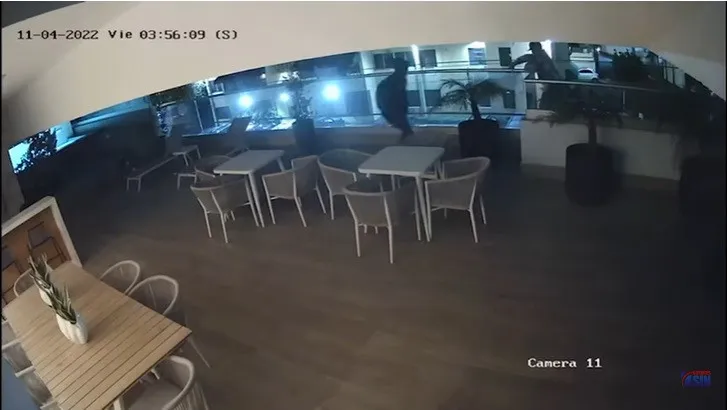 A las 3:06 de la mañana del viernes cuatro de noviembre, las cámaras de seguridad captan a un hombre caminando por el área social del segundo nivel de la Torre Mineri XVII (17) en el Ensanche Naco.