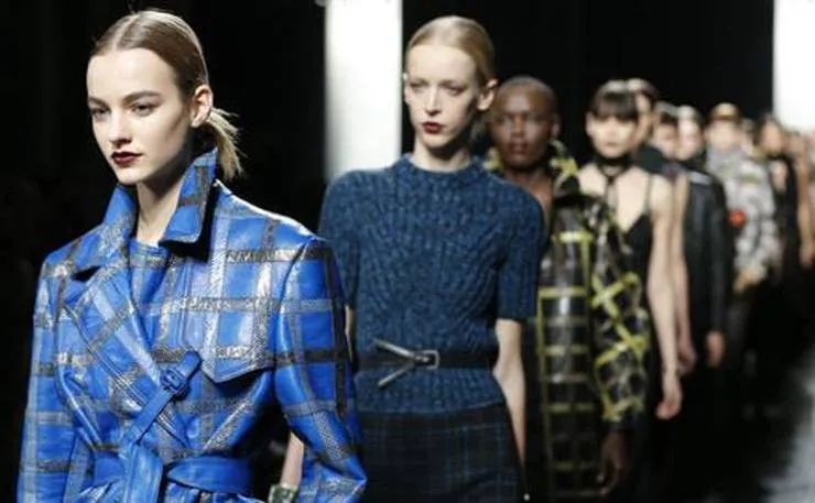 Prada presentó faldas cortas con una larga cola en colores negro y amarillo, combinadas con bolsos rojos y chaquetas de cuero o de traje.