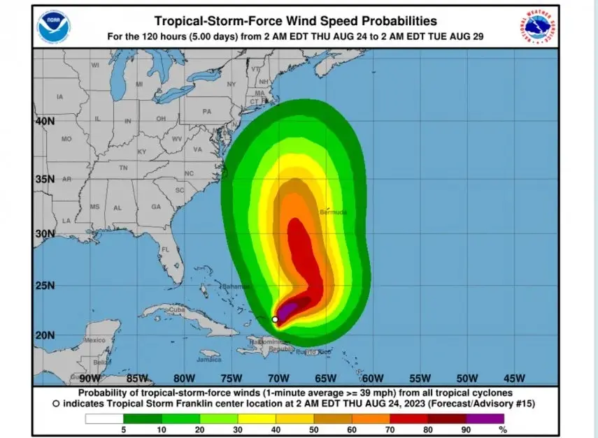 En la trayectoria pronosticada, el centro de Franklin continuará moviéndose más lejos de la República Dominicana sobre el suroeste del Atlántico hasta el fin de semana y sus vientos se irán fortaleciendo gradualmente hasta convertirse en un huracán en un par de días.