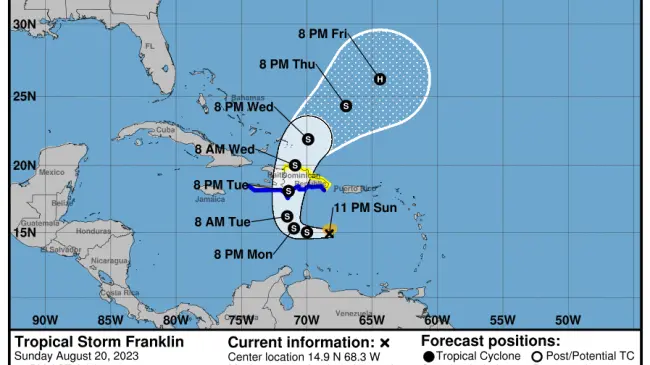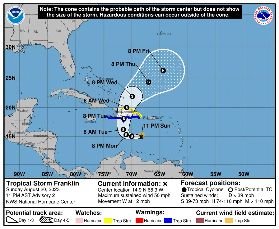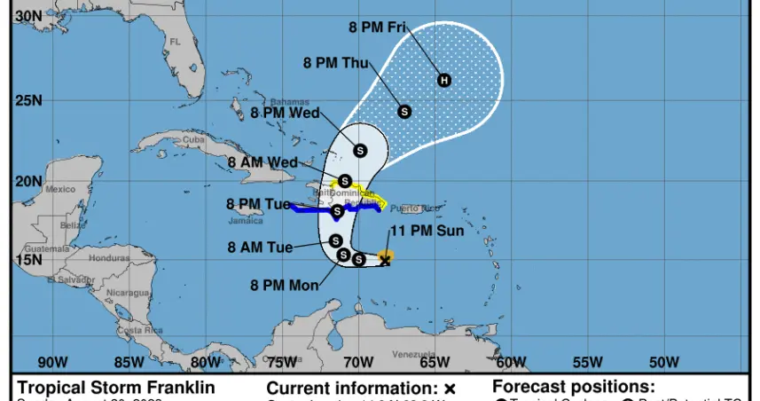 Santo Domingo.– SANTO DOMINGO.- El Centro Nacional de Huracanes de Estados Unidos, en su actualización de las 11pm de este domingo, informó que la tormenta tropical Franklin mantiene un máximo de vientos sostenidos de 50 mph y se mueve hacia el oeste a unas 12 mph.