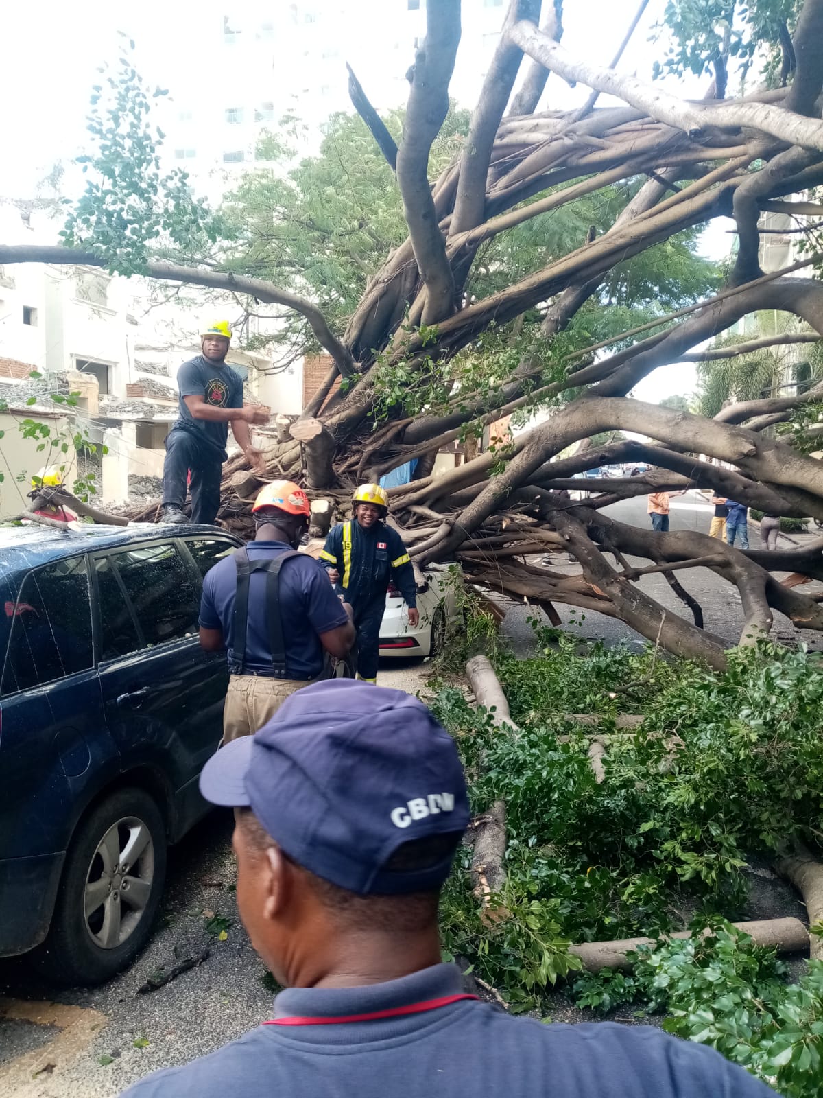 Tres unidades de rescate de los bomberos, junto a unidades de la Alcaldía del Distrito Nacional, del Ministerio de Obras Públicas y Edesur, trabajan para retirar los escombros del árbol y así poder dejar restablecido el tránsito en la referida vía capitaleña.