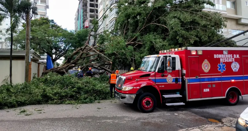 Tres unidades de bomberos, junto a la Alcaldía, Obras Públicas y Edesur, trabajan para despejar los escombros del árbol y restablecer el tránsito.