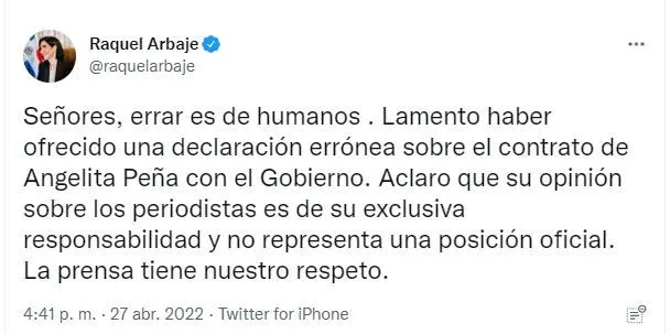 A través de su cuenta de Twitter dijo “lamento haber ofrecido una declaración errónea sobre el contrato de Angelita Peña con el Gobierno”.