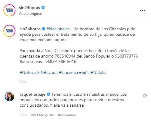 SANTO DOMINGO.- Tras una publicación de Noticias SIN sobre un hombre de Los Girasoles que pedía ayuda para costear el tratamiento de su hija, quien padece de leucemia mieloide aguda, la primera dama, Raquel Arbaje, respondió que el caso ya estaba en sus manos.