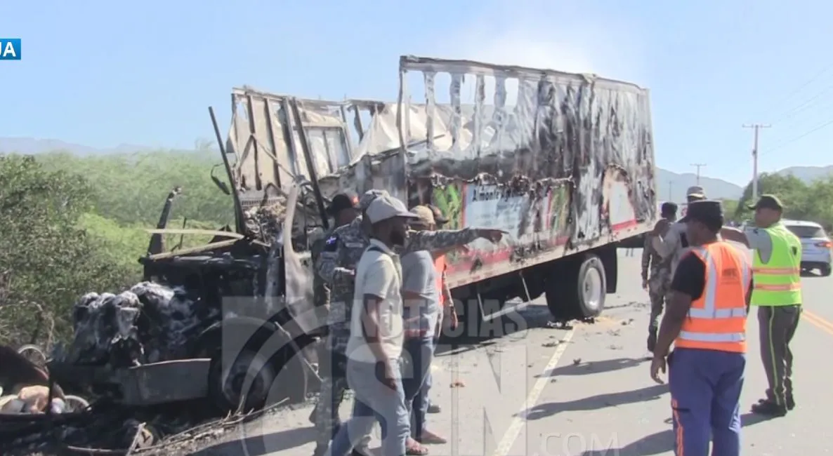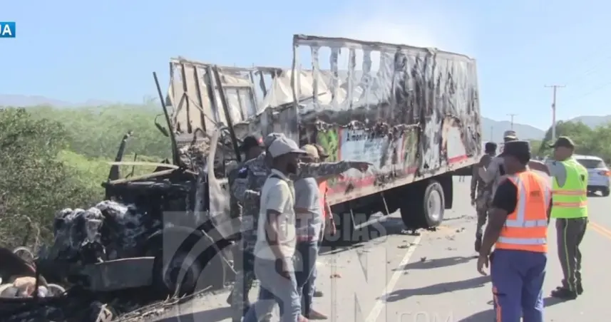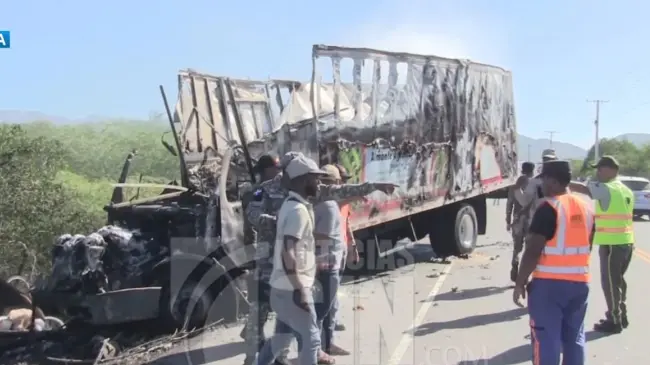 Azua.- Dos vehículos se incendian tras un accidente de tránsito en la carretera Azua - Baní, dejando un saldo de tres personas calcinadas y cuatro heridos.