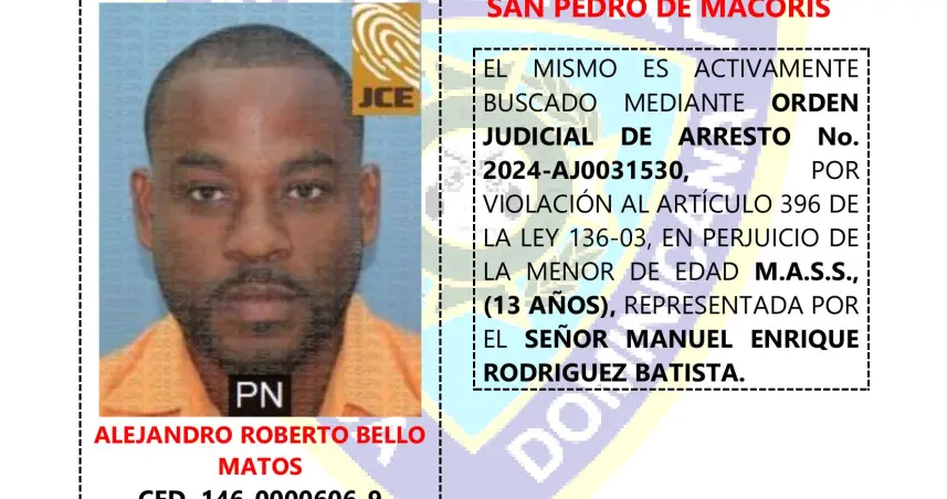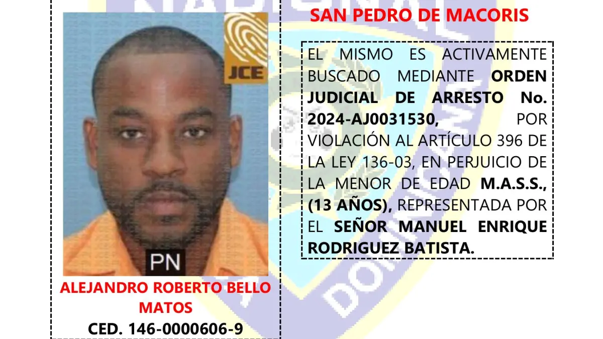 Ante la evidente intención de Bello Matos, quien no ha respondido a ninguno de los llamados y convocatorias de la Fiscalía de San Pedro de Macorís, el Ministerio Público, con la anuencia del tribunal, ha colocado en su contra el impedimento de salida del país y es buscado activamente mediante la orden de arresto No. 2024-AJ0031530.