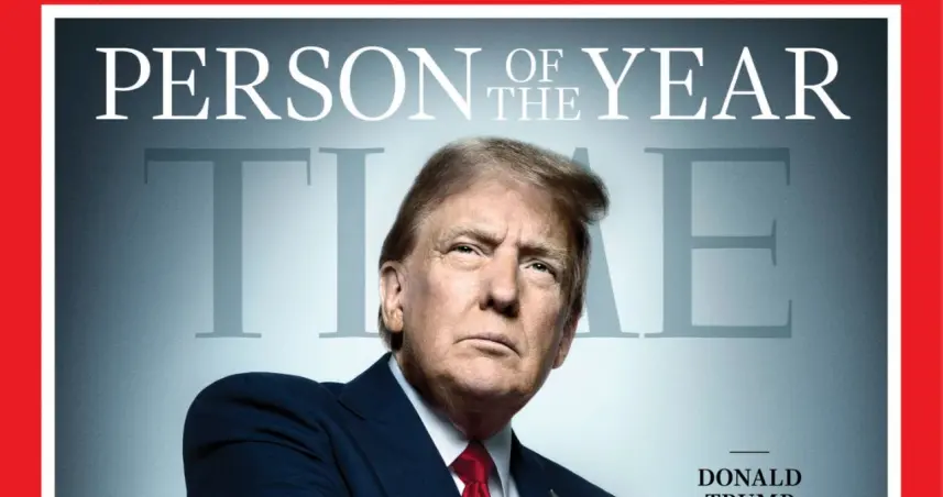 La portada de este año muestra a Trump luciendo su habitual traje con corbata roja sobre un fondo gris y con las manos del republicano entrelazadas, mientras mira desafiante al horizonte.