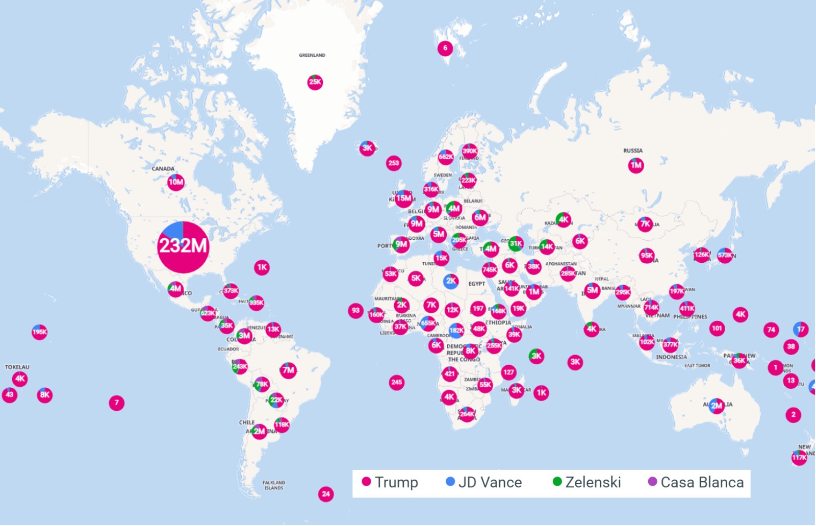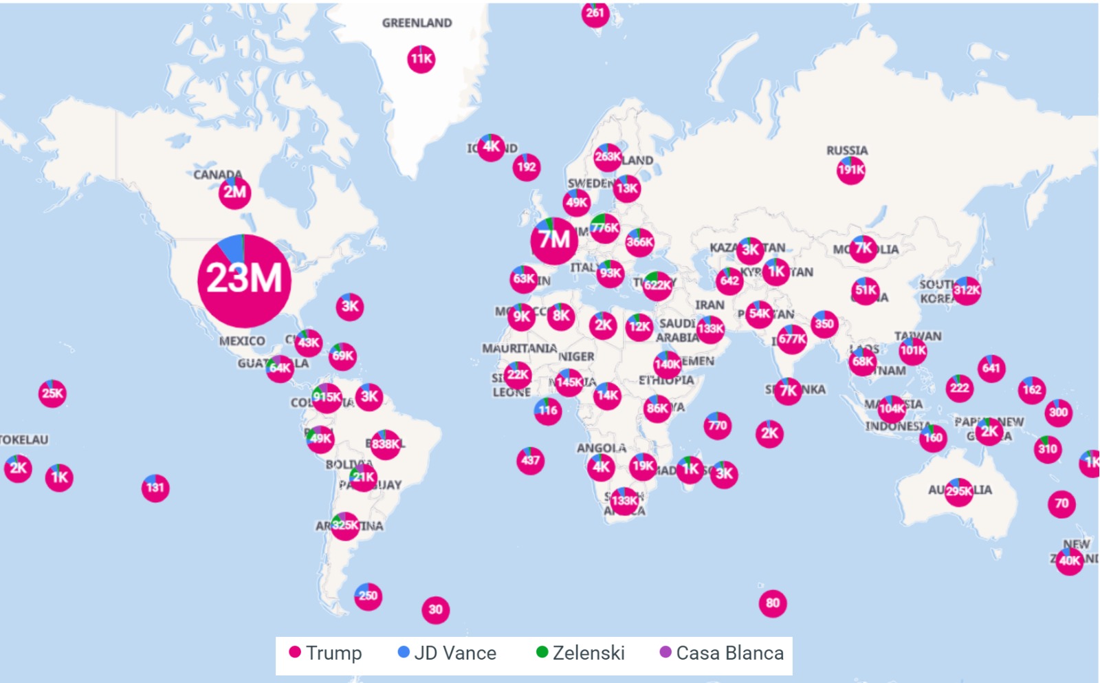 La reacción no se hizo esperar. En un mundo hiperconectado, el enfrentamiento se volvió viral al instante. Según datos digitales, Trump acumuló 34 millones de menciones y 250.7 millones de interacciones, superando con creces a Zelenski (983.9K menciones, 6.5M interacciones) y a la propia Casa Blanca (344.1K menciones). La conversación alcanzó 23 millones de menciones en EE. UU., 7 millones en Europa y cientos de miles en países como Colombia (915K), Brasil (838K), Italia (622K) y República Dominicana (88K).
