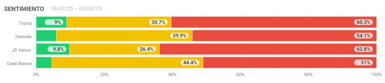El sentimiento en redes fue implacable: 60.4% de los comentarios sobre Trump fueron negativos, mientras que Zelenski y la Casa Blanca no se quedaron atrás con un 54.2% y 51.1% de rechazo, respectivamente. Plataformas como Bluesky y X (Twitter) lideraron el debate (87-91% de la cobertura), seguidas por YouTube y medios tradicionales que amplificaron el alcance hasta los 1.4 billones de personas. Fue un juicio público en tiempo real, y el veredicto fue claro: nadie salió ileso.