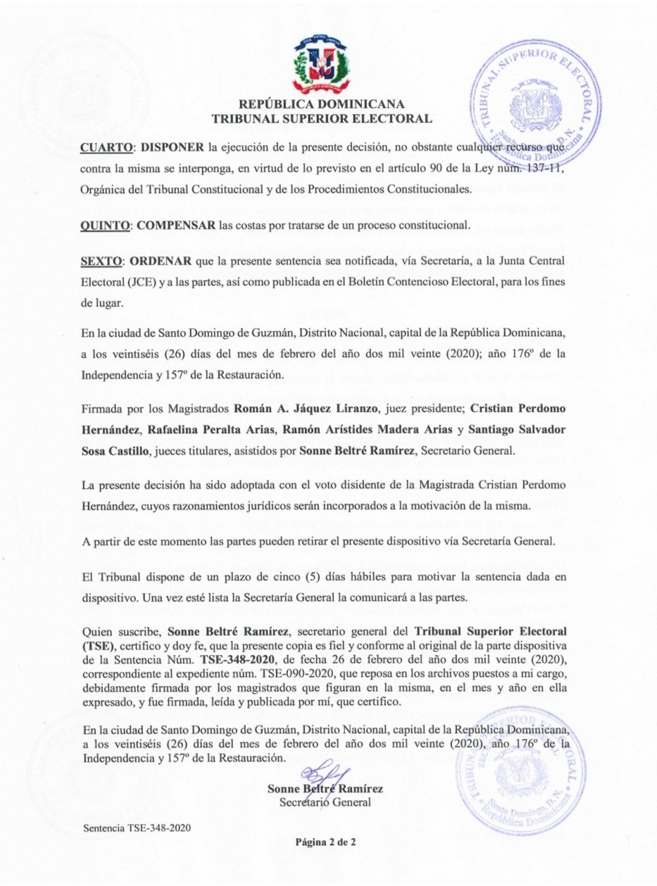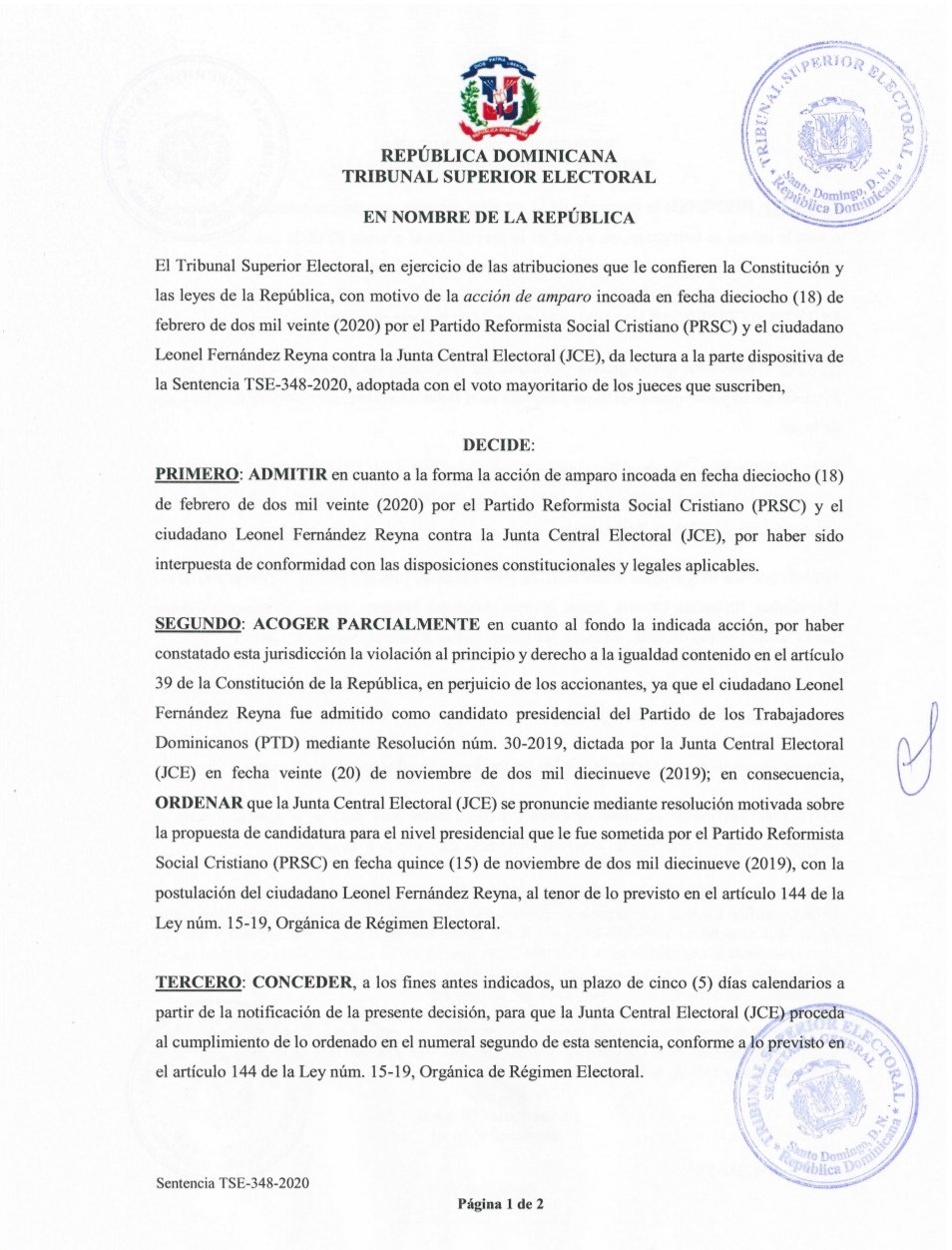 Así mismo, el Tribunal Superior Electoral hizo referencia a la violación al principio de igualdad, ya que Fernández fue admitido como candidato presidencial por el Partido de los Trabajadores Dominicanos.