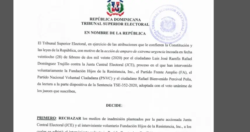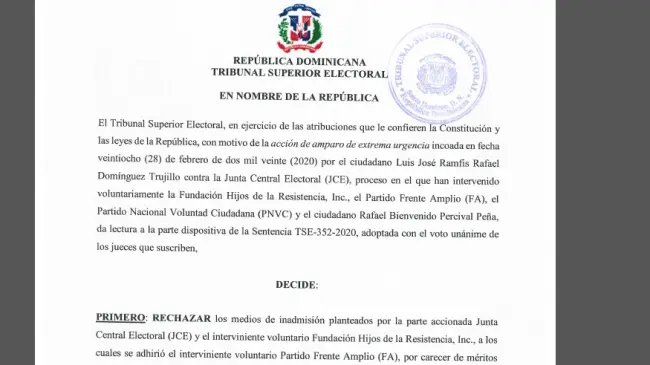 SANTO DOMINGO, República Dominicana.-El Tribunal Superior Electoral, rechazó este viernes la candidatura presidencial por el Partido Nacional Voluntad Ciudadana,de Ramfis Domínguez Trujillo, por carecer de méritos jurídicos.