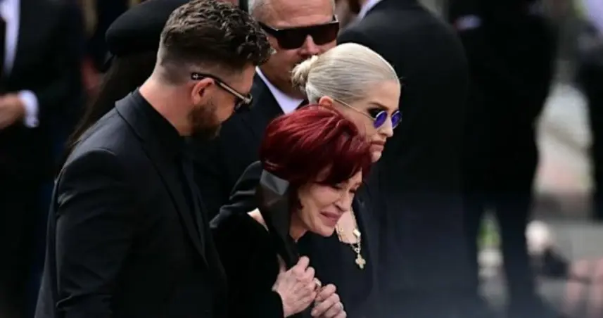 Llorando y con la cabeza gacha, Sharon iba acompañada de sus tres hijos, Aimee, Jack y Kelly, y saludó a la multitud que coreaba el nombre del cantante.