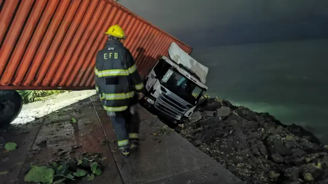 El camión no llegó a caer en el mar y quedó en el arrecife con tres neumáticos destruidos y despedazado el tanque de combustible.