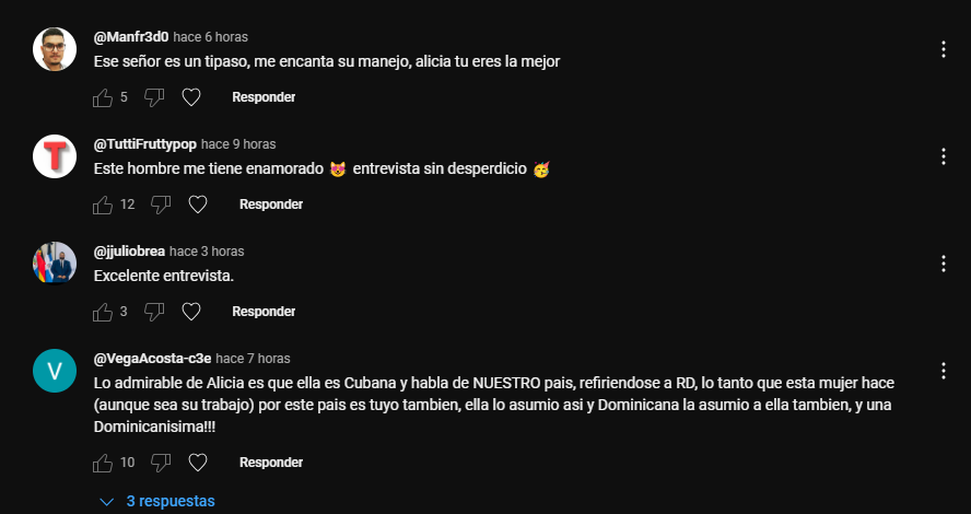 Otro suscriptor expresó su admiración por la periodista: "Alicia, tienes mis respetos por la profesional que eres en tu trabajo. Excelente tu entrevista, felicidades".