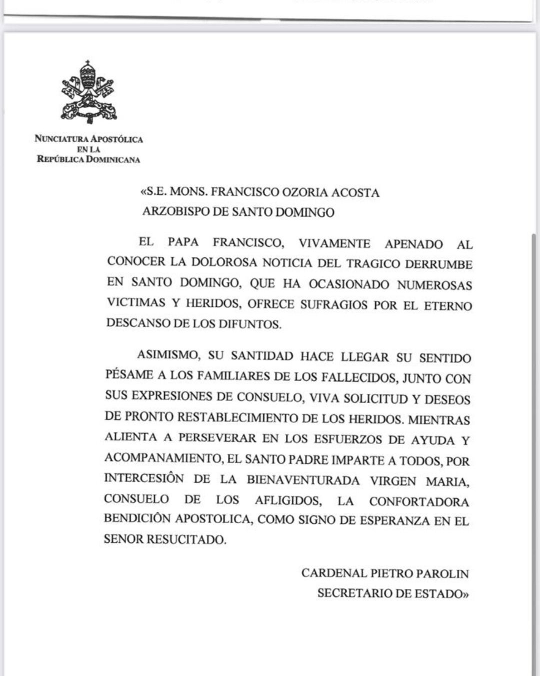 El pontífice, conocido por su sensibilidad hacia el sufrimiento humano y su compromiso con los más vulnerables, envió un telegrama de condolencias al arzobispo de Santo Domingo y una misiva a la Nunciatura Apostólica de la República Dominicana. En ambos documentos expresó su dolor por la tragedia y su solidaridad con las víctimas y sus familias.