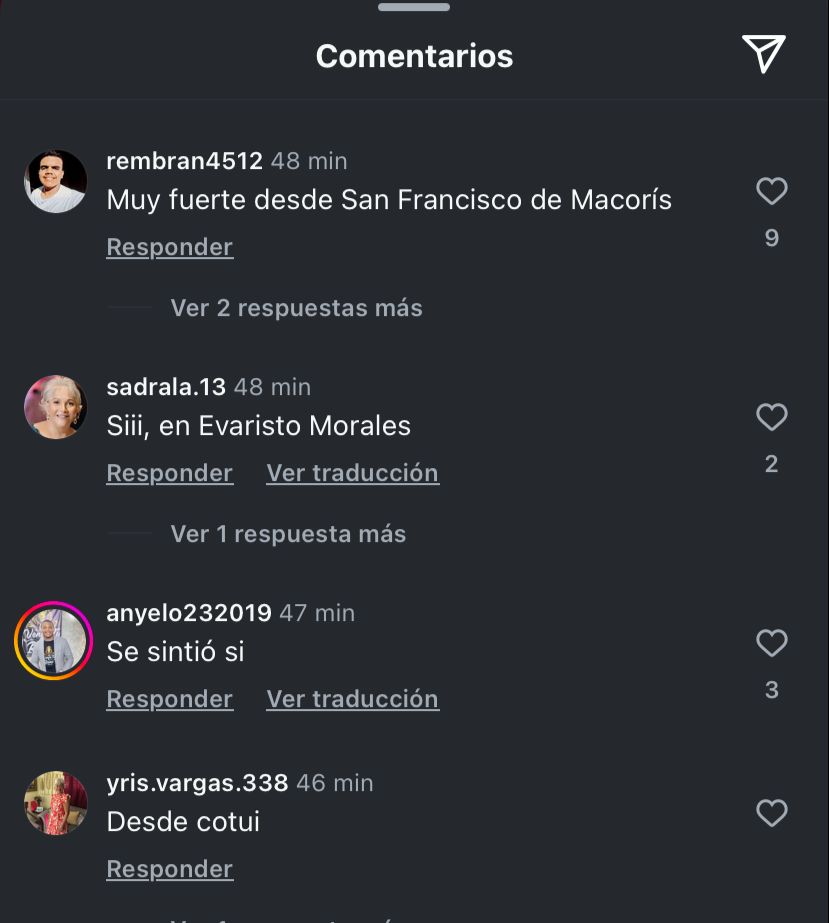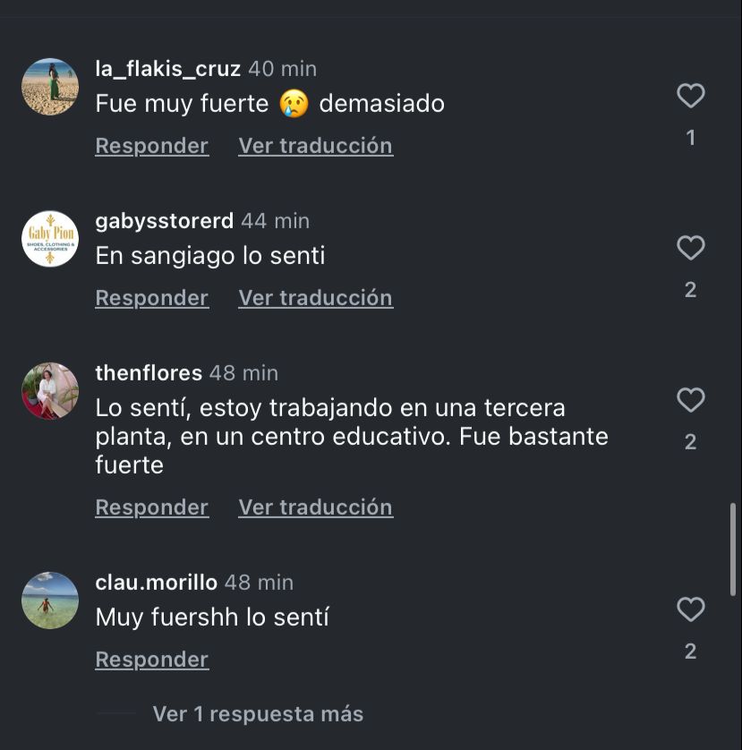 “Sentí el temblor en Santiago”, “en Santo Domingo lo sentí”, “fue muy fuerte en Cotui”, “fuerte en Bonao”, “fuerte en Puerto Plata”, “lo sentimos en San Cristóbal”, son algunos de los comentarios que han hecho los usuarios de Noticias SIN, diciendo desde donde sintieron el temblor de tierra.
