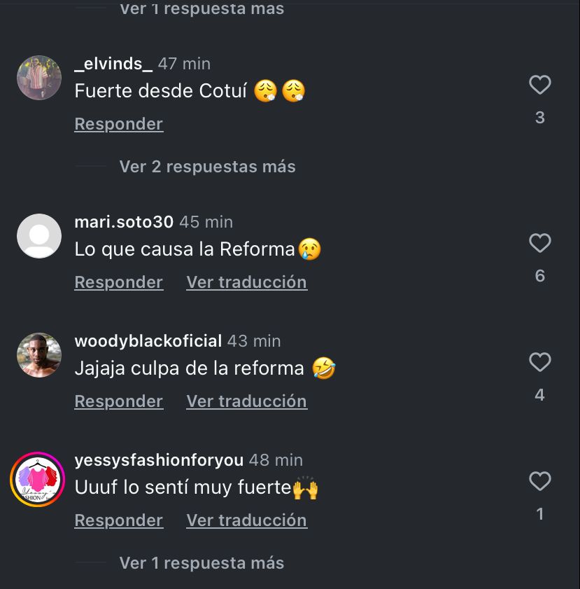 Mientras que como buenos dominicanos nunca falta el buen sentido del humor por que otros de los comentarios son: “Por la reforma tembló la tierra”, “eso el país temblando del miedo por la reforma”, hasta la tierra está asustada por la reforma”.