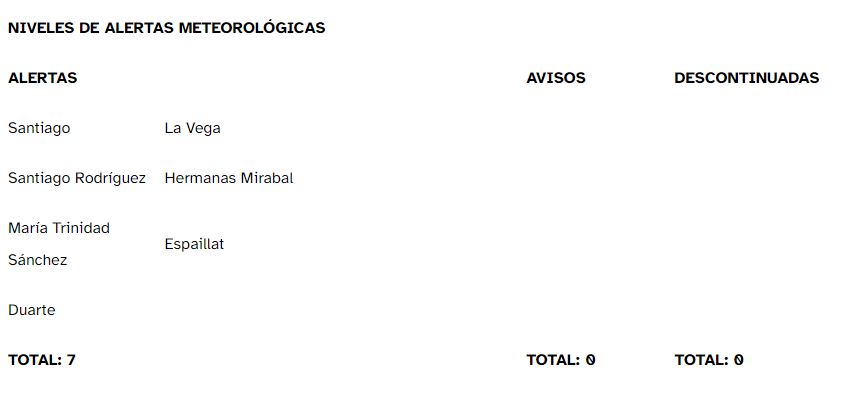 La ONAMET debido a las lluvias ocurridas y las que se esperan en las próximas horas, mantiene las ALERTAS METEOROLÓGICAS, ante posibles crecidas repentinas de ríos, arroyos y cañadas, generadores de inundaciones urbanas y/o rurales, así como, deslizamientos de tierra.