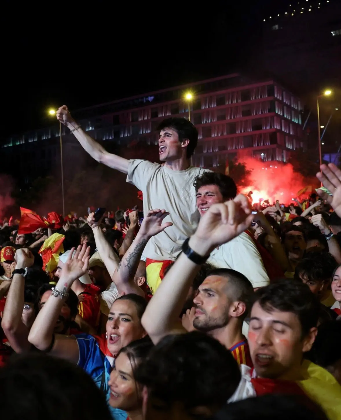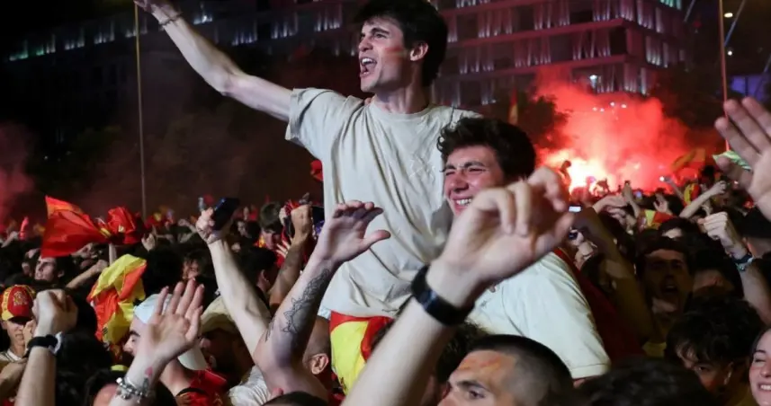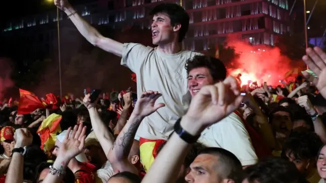 Si durante el partido celebraron con efusividad los goles de Nico Williams y Oyarzabal y se escucharon en distintos puntos de la ciudad tracas y petardos tras los tantos españoles, a la conclusión del encuentro se intensificaron las celebraciones.