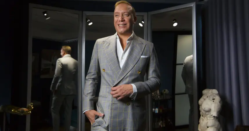 El actor español residente en República Dominicana, Víctor Gómez, optó por un traje combinado con una chaqueta cruzada de seis botones en gamuza negra. El pantalón en gabardina italiana spandex y la camisa de cuello Mao fueron detalles que contribuyeron a un look impecable y sofisticado.
